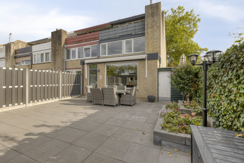 De binnentuin van circa 9,32 bij 7,86 meter vormt een echt verlengstuk van de woning en is vanuit de woonkamer, de keuken en twee slaapkamers toegankelijk. De tuin is onderhoudsvriendelijk aangelegd met fraaie tegels en verschillende terrassen, waaronder een overdekt terras waar je beschut buiten kunt zitten. Of je nu de dag wilt beginnen met een kop koffie in de ochtendzon of juist wilt genieten van een gezellige barbecue met familie in de avond, er is altijd een fijne plek in de zon of de schaduw te vinden. De slaapkamer aan de tuinzijde is voorzien van rolluiken en de kamer die nu als atelier dient heeft een zonnescherm. Ook bij de keuken hangt een zonnescherm, waardoor je de warmte in de zomer gemakkelijk buiten houdt. Een buitenkraan en buiten stopcontacten maken het praktisch onderhoud compleet. Omdat het een patiotuin betreft en er geen hoogbouw om de woning heen staat, is er altijd wel een plekje in de zon of de schaduw te vinden. De tuin is voorzien van sfeerverlichting tussen de beplanting die automatisch aangaat als het begint te schemeren. De tuinverlichting tegen de muren is van binnenuit te bedienen.